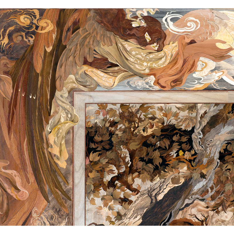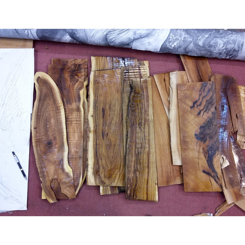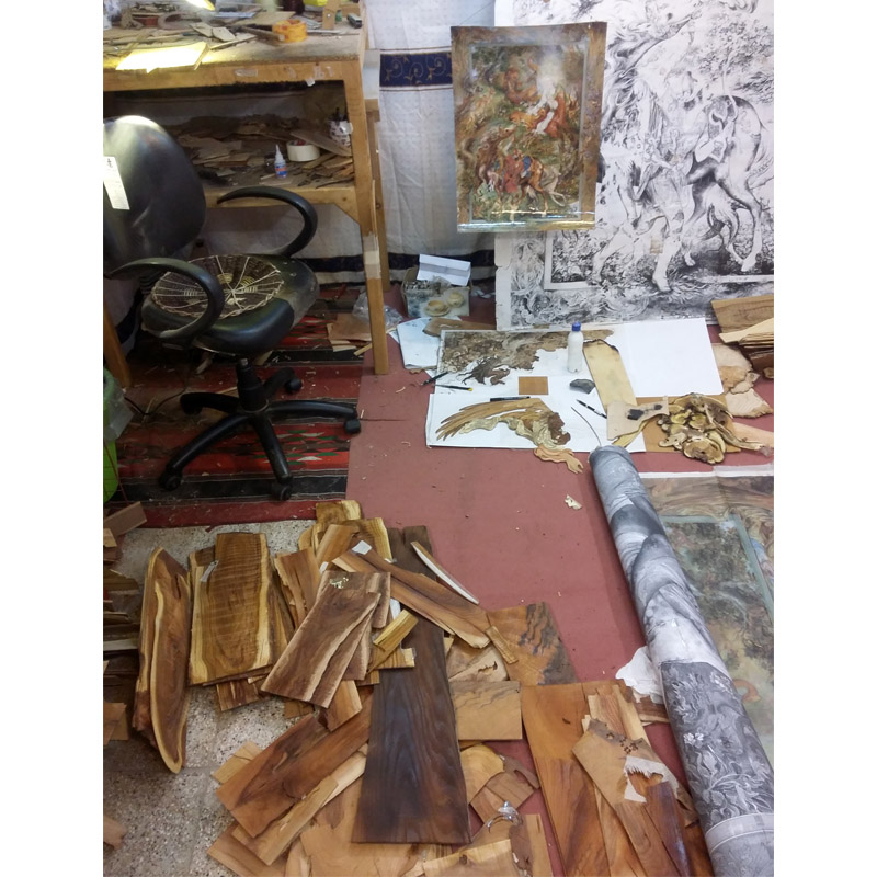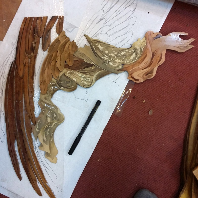 For creating the delicate and wavy forms of the angels’ hair, instead of the classic method and making various cutouts (that destroys the pattern and texture of the wood and reduces its endurance), the form and shape of the hairs were inlaid using a combination of the natural textures of Syrian mesquite plant in controlled directions. This unique style and method of implementation was also used in the creation of the feathers of the angels and some other parts of the work.