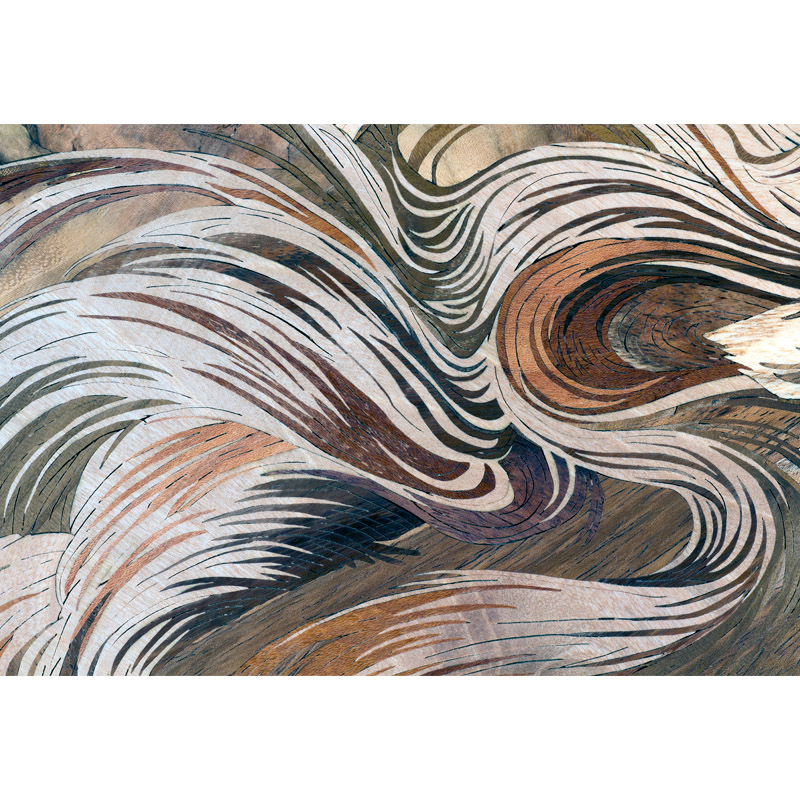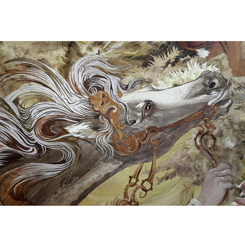 The method of pattern composition in the creation of the horse was used in conjunction and in accordance with the methods of color separation and miniature. This is more evident on the head and feet of the horse. The whole body of the horse is made up of silk tree wood.