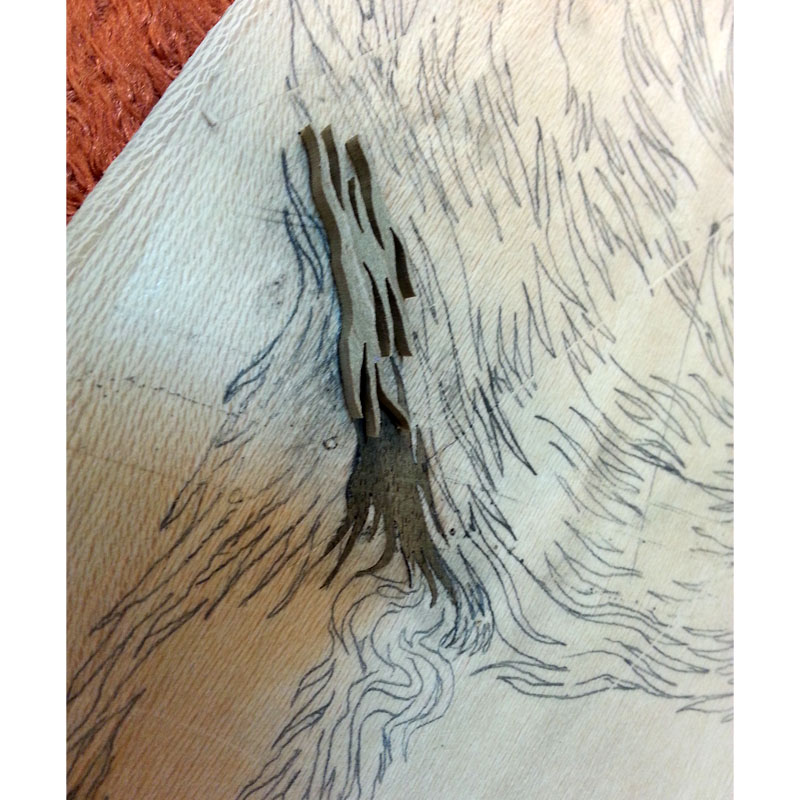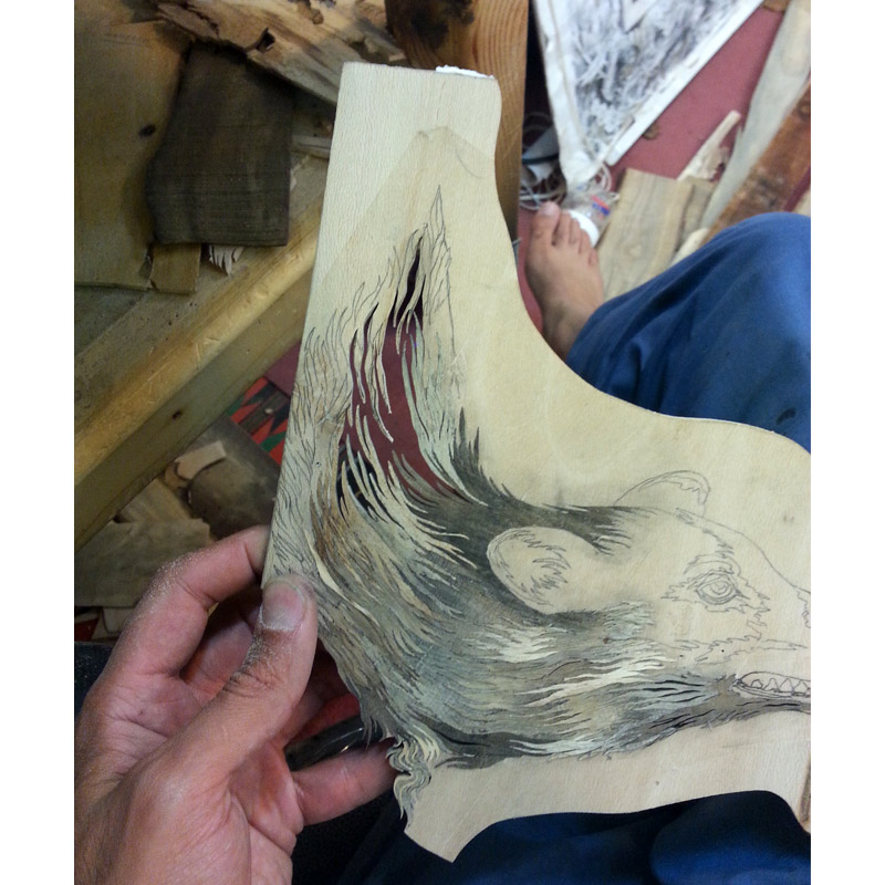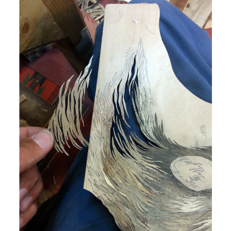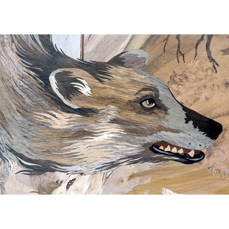 In the preparation of this part, an attempt has been made to clearly illustrate the coarse and thick fur of the wolf in a way that suggests its nature and character. To the same effect, woods of grey and brown colors and hair-like coarse textures were used. Moreover, rapid zigzag cuts were implemented in the composition of woods in order to better infuse the beholder with a sense of innate savage and fierceness of the wolf.